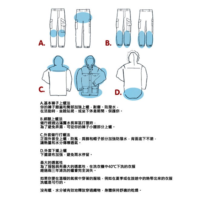 特別為G -1000 ®材質所設計的Greenland Wax防潑水蠟塊,可透過吹風機或熨斗加熱的方式使其讓G -1000 ®面料吸收,依據自己習慣及環境因素決定上蠟的次數,來決定不同程度的防潑水性及防風性需求。