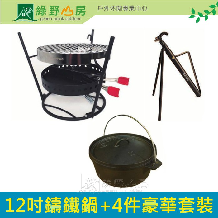 CampMaid 美國 12吋鑄鐵鍋+四件豪華套裝 鍋蓋架兼起鍋勾+荷蘭鍋烤架+烤網兼內網架+夾式炭盆 60010