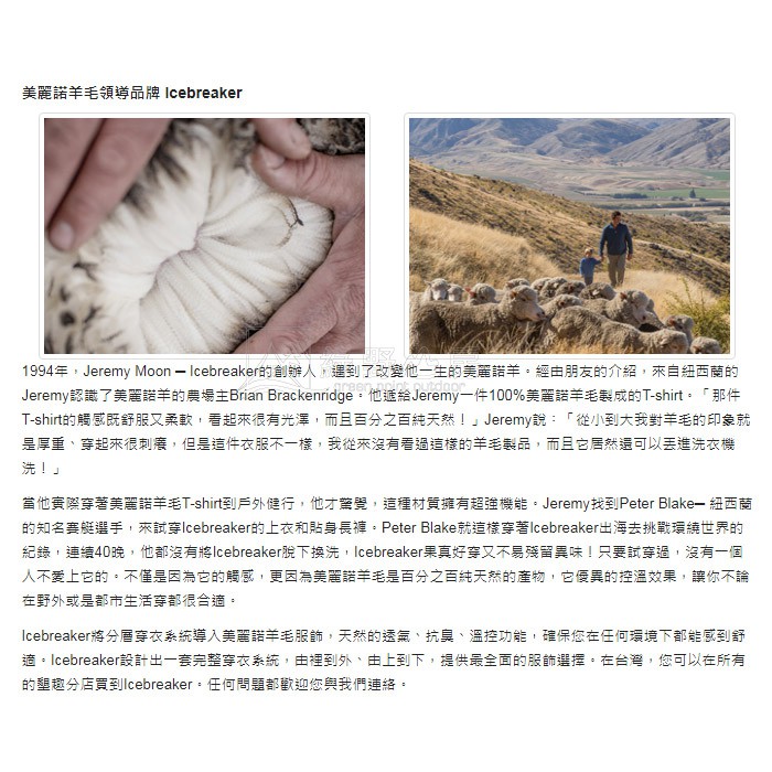 正是因為高海拔的環境才使得美麗諾羊毛又細又柔軟,可是一旦超過6歲,美麗諾羊就無法繼續在高海拔山區生活,自然而然,羊毛的品質就跟著下降了。所以Icebreaker堅持只使用高海拔美麗諾羊毛,一隻Icebreaker美麗諾羊一年約製造出五件磅數200的上衣(等於一輩子只能生產珍貴的三十件服飾)。就是因為如此執著於品質,Icebreaker的產品不但透氣性佳,還能夠適時調節體溫防止失溫;而不同於傳統羊毛的纖維尺寸,纖細的美麗諾羊毛讓衣服重量更輕了,刺養的感覺也不見了!