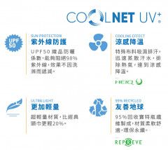 - CoolNet 頭巾使用 Polygiene 銀離子抗菌專利技術,能夠有效地抑制細菌繁殖減少異味產生,同時不對皮膚產生副作用。