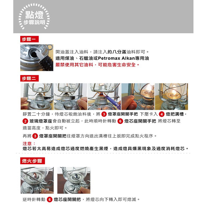 燃料:煤油、燈油(石蠟油)、Alkan(Petromax)