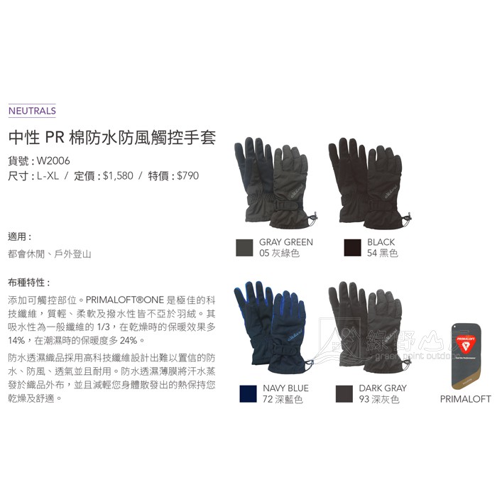 Wildland荒野 台灣 中性 兩色 PR棉防水防風觸控手套 保暖手套 W2006
