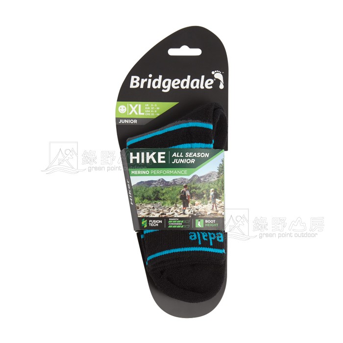 Bridgedale 英國 童 健行家中筒羊毛襪 美麗諾四季羊毛襪 灰/黑 710026-828