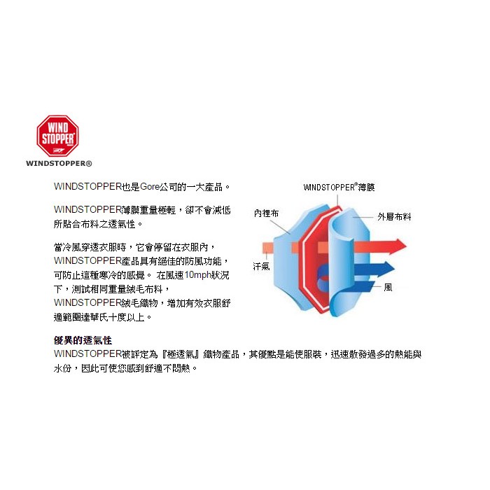 - 採用 WindStopper® 防風透氣材質,讓您在戶外活動得心應手