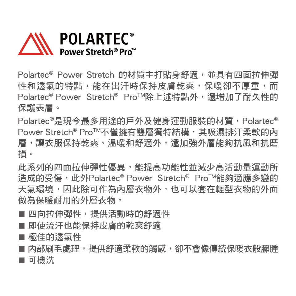 使用 Polartec Power Stretch Pro,其重量及熱產能表現極佳,舒適保暖且快乾。尼龍的比例讓外層堅韌、抗磨。