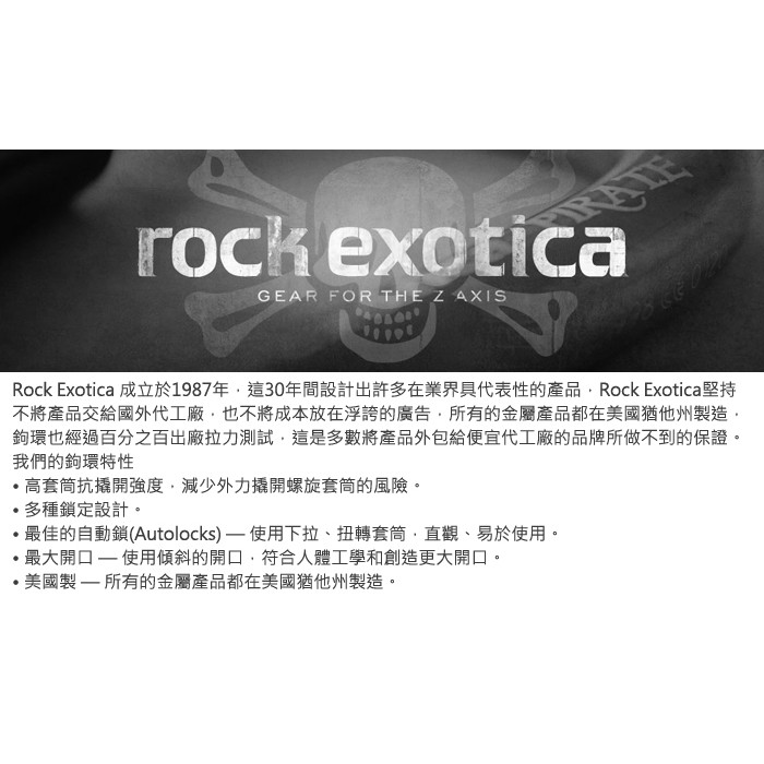- 0.5"(約1.27cm)粗的斷面直徑,比起一般沖壓製成的勾環,更加耐用, 可承受沾汙繩索的摩擦、或相連金屬器材的邊角擠壓