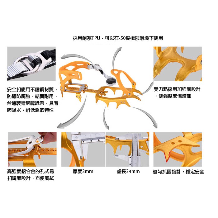 所有繫著冰爪,尼龍絲帶,硬度高,韌性好,適合長時間行走,舒適輕便。