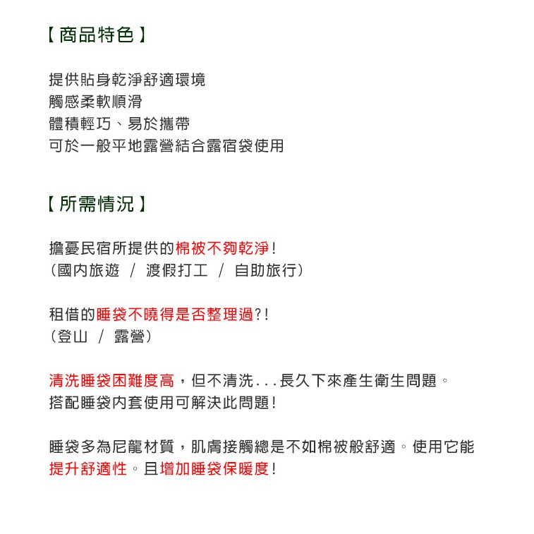(睡袋內套材質非常輕薄,主要的用途為改善乾淨度,提升舒適性,增加保暖度,故單獨使用是無法像睡袋般保暖,故在選購時請特別注意您的需求與用途!!!)