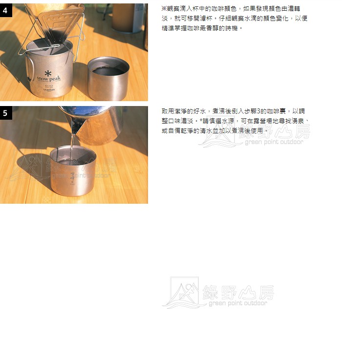 在戶外活動的過程中,隨時都是最適合享用咖啡的時光。無論是晨間為了喚醒身心、或是在營火旁享受悠閒時光,還有在用餐完畢後,總是少不了一杯香醇的咖啡。置身在大自然環境中,當然要用最考究的方式沖煮咖啡。Snow Peak的咖啡用具有濾壓式、手沖式、還有滴濾式,可說是一應俱全。SP鈦金屬咖啡/奶泡組,是鈦金屬製的咖啡壺與奶泡杯的套組。本產品可直接以爐火加熱,將水煮沸以沖泡咖啡。手沖式咖啡濾器,則有跟焚火台一樣的別緻造型。至於滴濾式咖啡壺,則是強悍的不鏽鋼製品。以營火為伴、在野地中享受香醇的咖啡時,Snow Peak咖啡用具能協助您自由發揮,讓您的咖啡時光更加愜意。