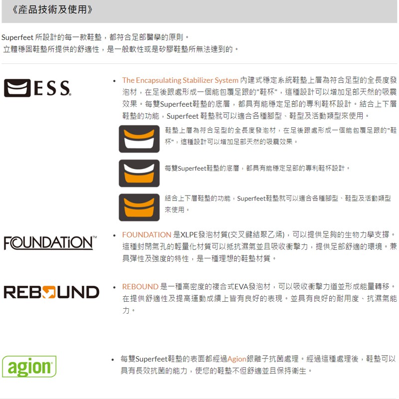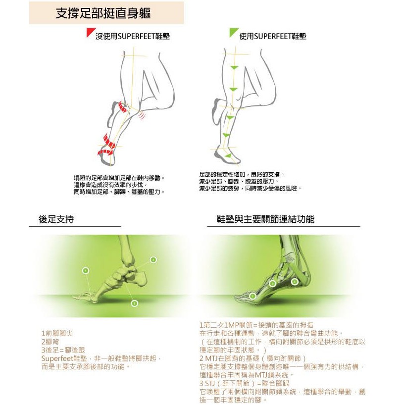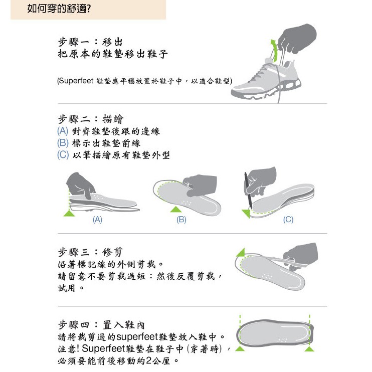 - Superfeet專利的形狀提供完美的舒適性,可以減少足部、腳踝與膝蓋的壓力