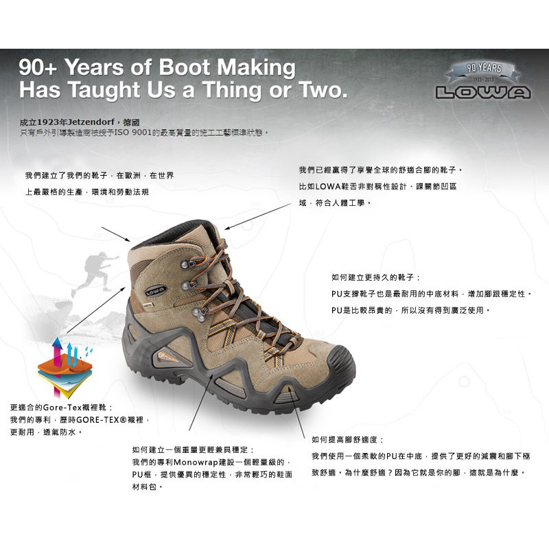 LOWA堅持歐洲原產,產品以其卓越的舒適性及耐用性著稱於世;並且LOWA品牌已入選德國國家製鞋標準乃至成為業界典範。同時LOWA廣泛採用世界知名Gore-tex功能薄膜及Vibram外鞋底,並且LOWA多年來一直為Gore公司於歐洲最大的鞋類合作夥伴。